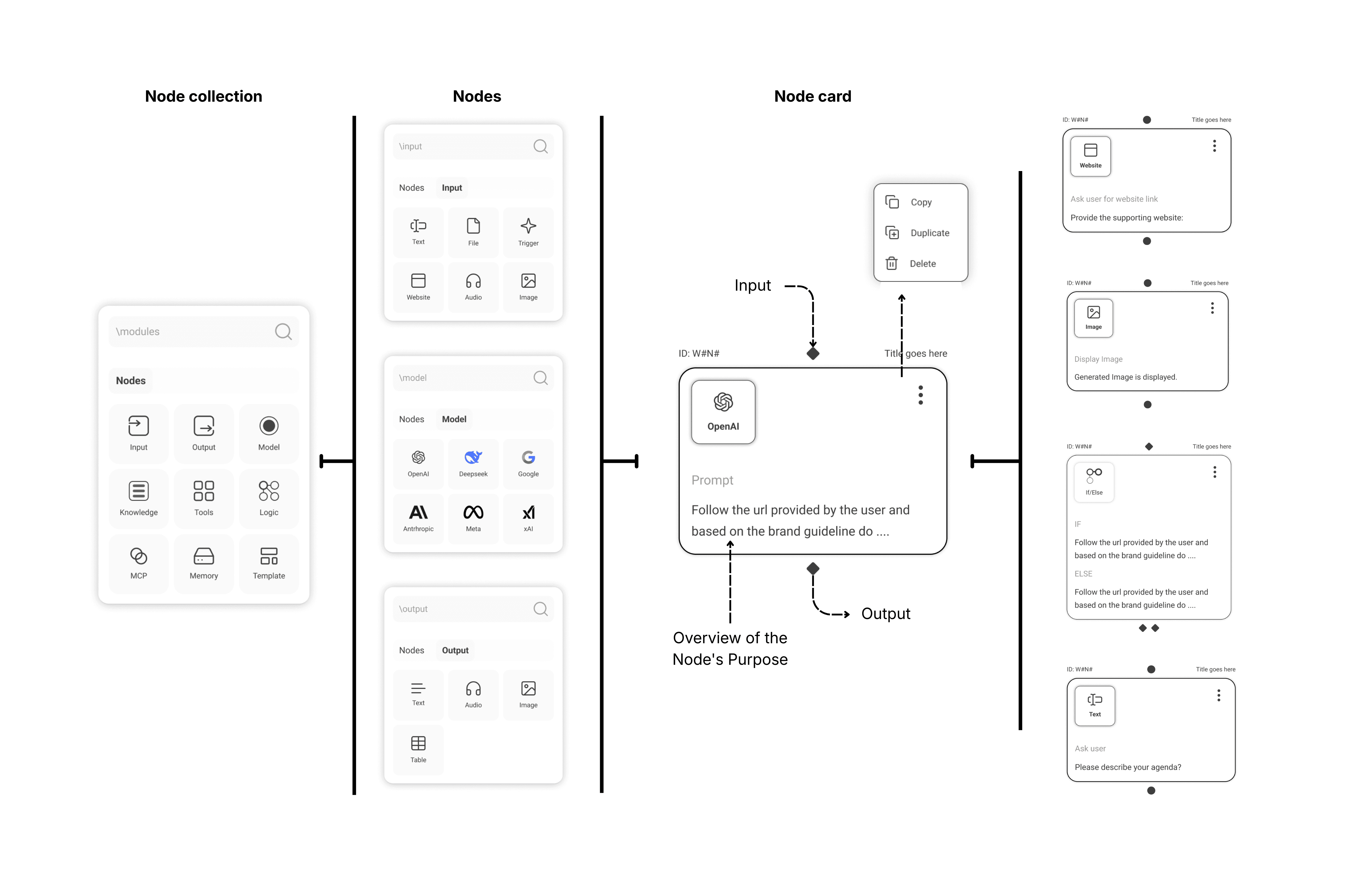 Cards surface the essence of each step – prompts, inputs, logic – enabling users to understand workflows at a glance.