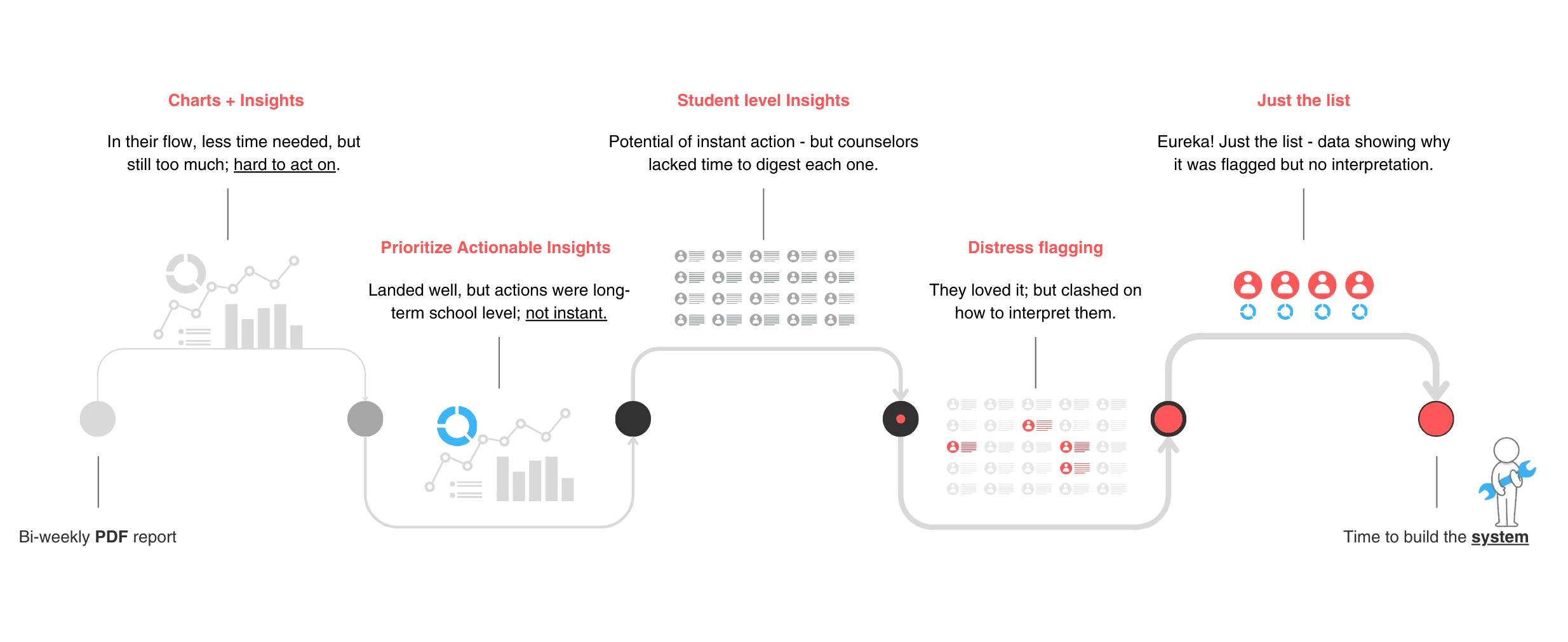 I partnered with our researcher and SEL expert to send bi-weekly insight reports via email, iterating weekly based on counselor feedback. This allowed us to test: