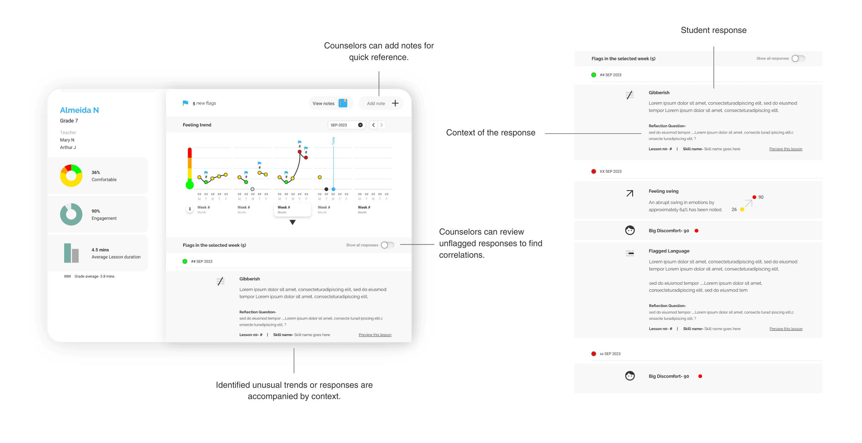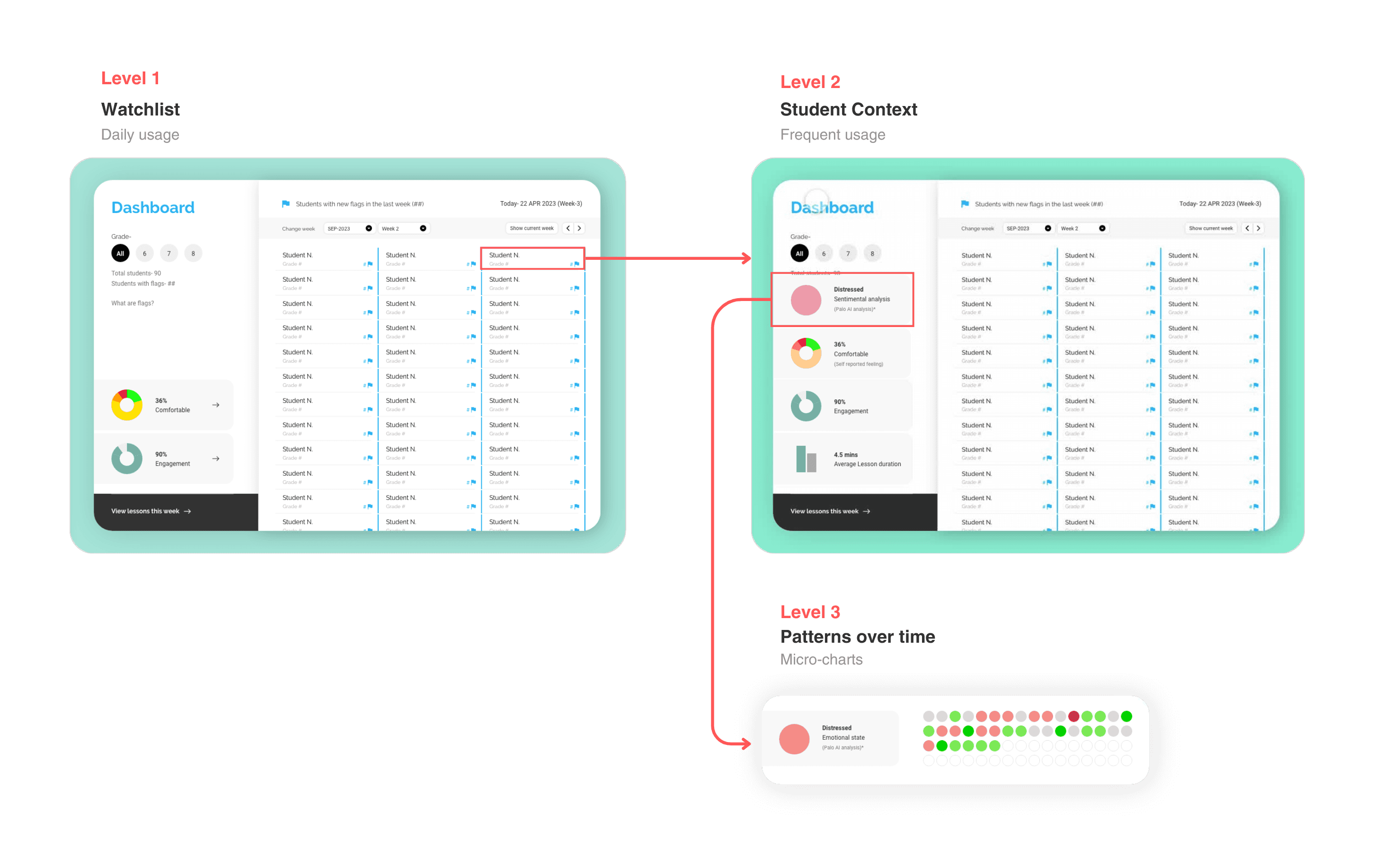 On selection, counselors saw recent emotional signals and excerpts from student responses.Level 3 – Patterns over time