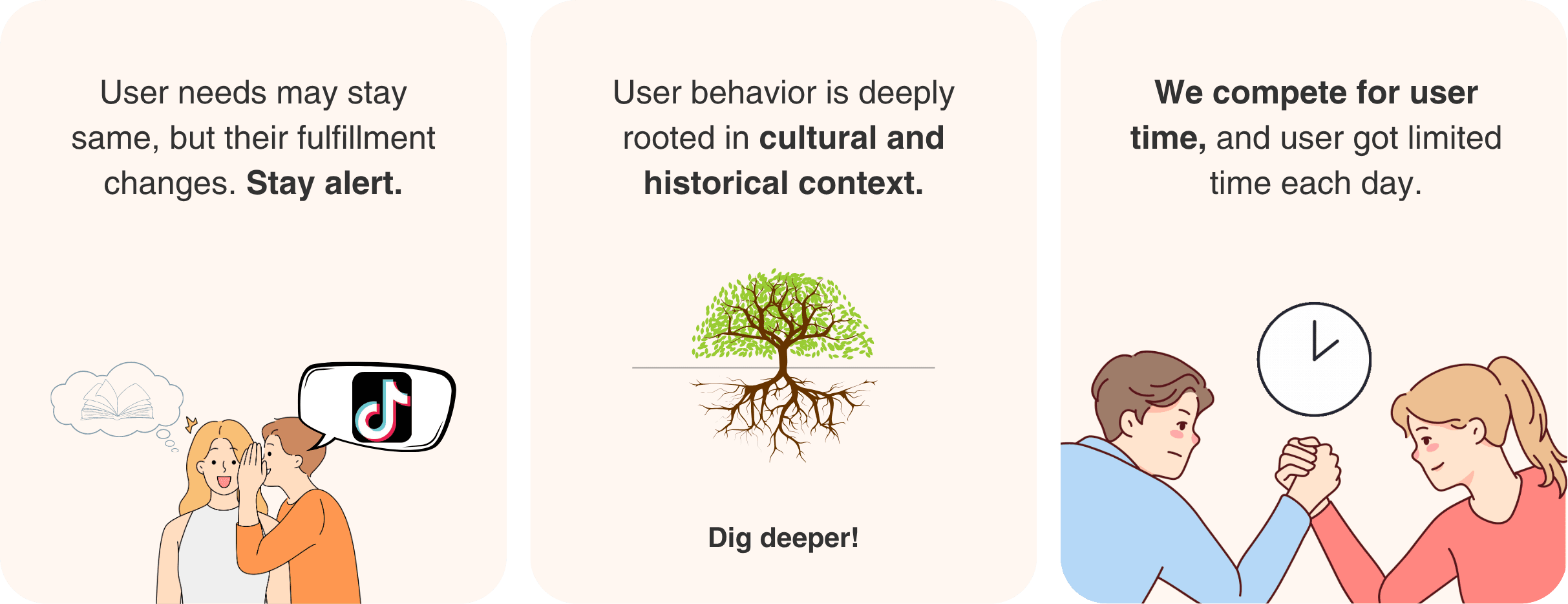 User needs may not change – formats do, shaped by culture, and ultimately everything competes for limited attention.
