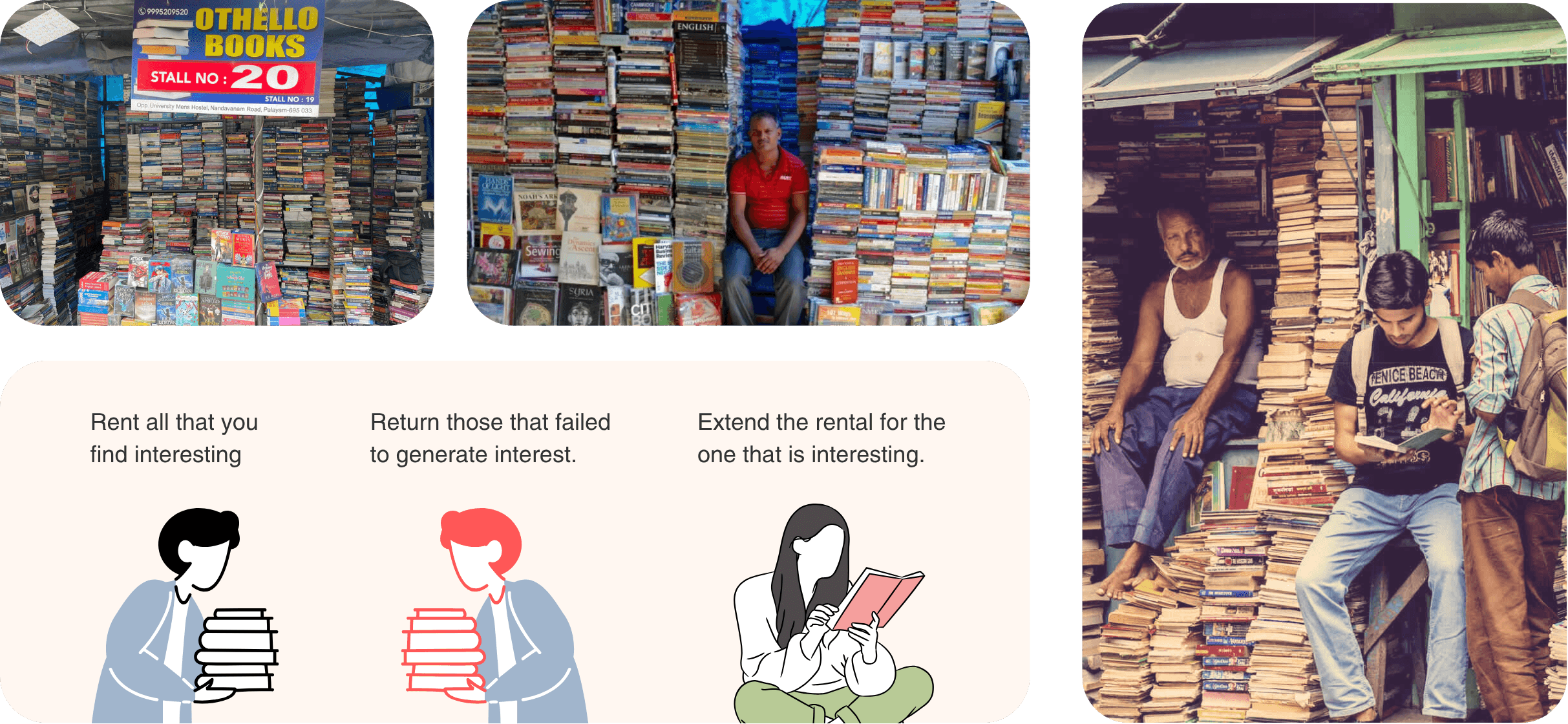 Neighborhood book rental vendors. Users in the rental era comfortably took risks by renting multiple books at low costs to explore at home. Users had willingness to explore premium new or unknown titles/authors for a negligible cost.