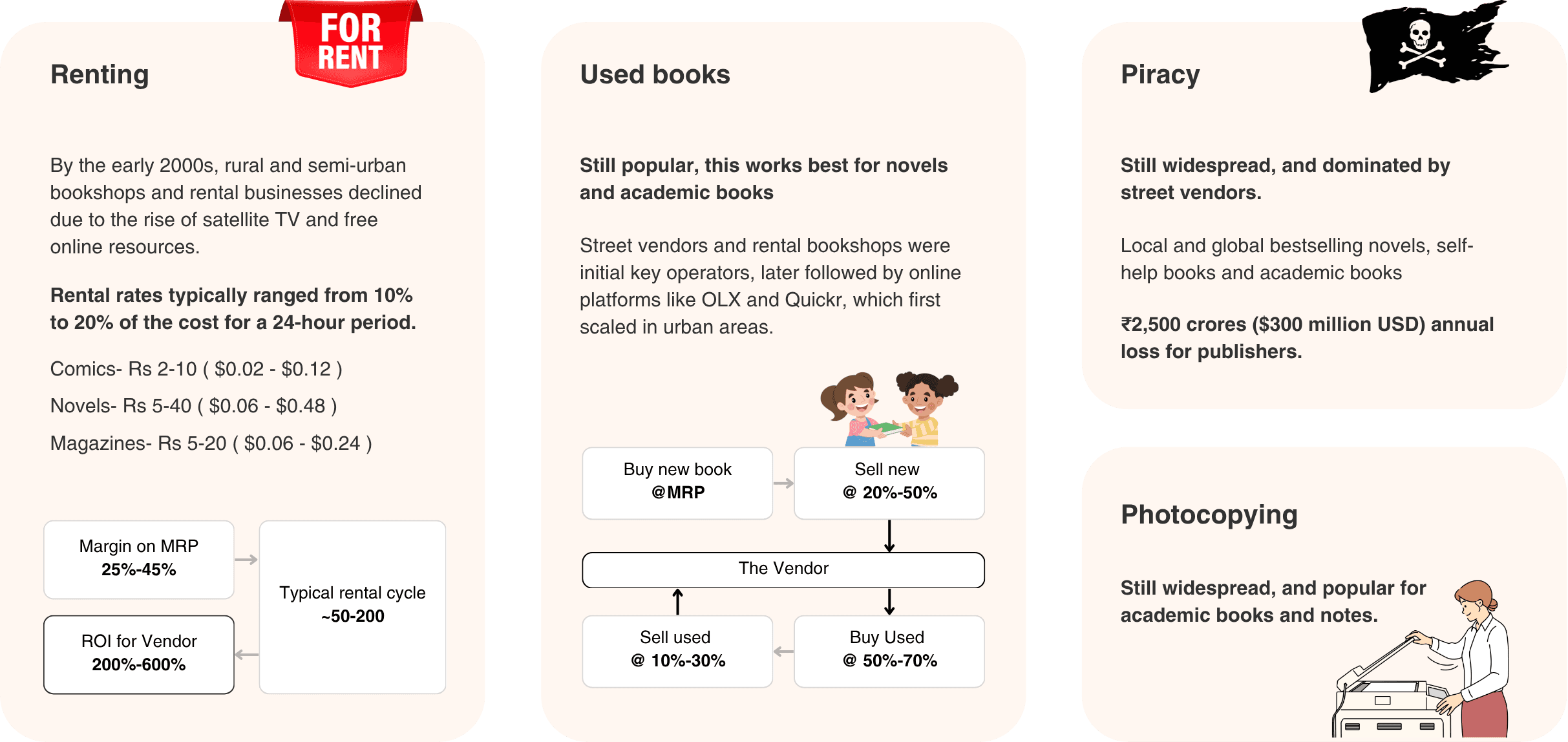 Users accessed books through a mix of low-cost rentals, second-hand resale loops, and informal channels like piracy and photocopying – optimizing for affordability over ownership.