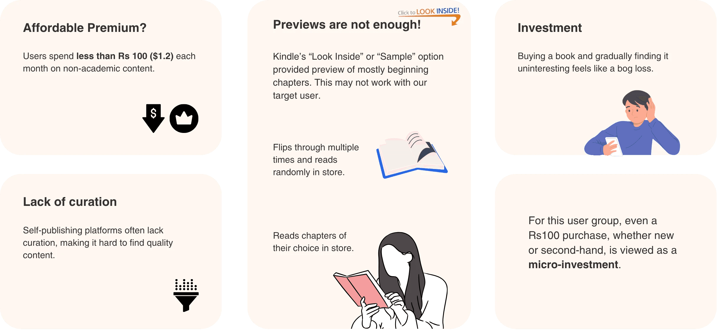 Users treat even small book purchases as risky micro-investments – so they seek flexible sampling, low commitment, and trusted curation before paying.