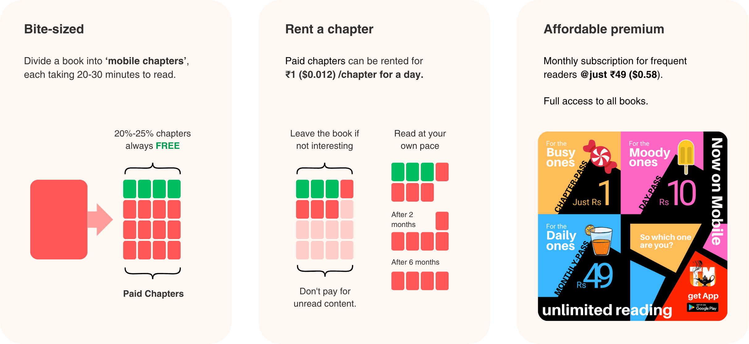 Break books into free-to-start, pay-per-chapter units with ultra-low pricing – so users pay only for what they actually read.